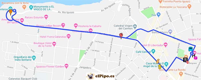 Llegaremos a Iguazú poco antes de las 16h, y después de coger las maletas, tomaremos un taxi/remis hasta nuestro hotel (20Km, 25m):
