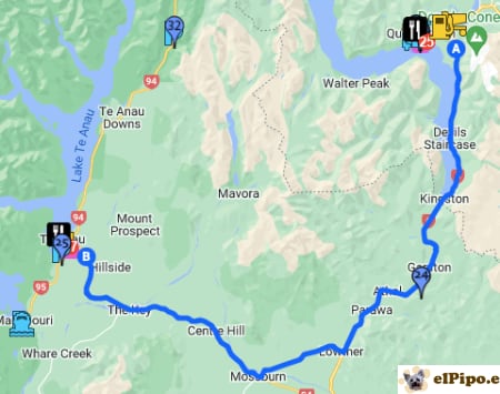 Recogemos el coche en el parquin y ponemos rumbo a nuestro destino durante los 3 próximos días, Te Anau (171Km, 2:10h).