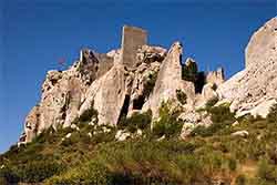 El castillo fue erigido en el siglo XI por los señores de los Baux. Durante los siglos XII y XIII, Baux fue un importante emplazamiento donde convergían la cultura y la política de la Provenza francesa medieval, principalmente a consecuencia del poder reinante de la familia de los señores de los Baux, aunque sufrió a menudo guerras locales y, en particular, las guerras baussenques entre 1145 y 1162 por la sucesión de Provenza. Del año 1372 al 1399, Raimond de Turenne, vizconde de Turenne, pasó a ser el señor del castillo y las posesiones; en 1426, los Baux son vinculados al Condado de Provenza, antes de que pase a ser anexionado definitivamente a la corona de Francia en 1486. En 1528, el castillo pasa a ser administrado por el condestable Anne de Montmorency y, de 1562 a 1598, sufre de nuevo los efectos de nuevas guerras, las de religión en Francia. Finalmente es desmantelado en 1632 y se hunde en el olvido. La familia Grimaldi, la actual familia real de Mónaco, fue la última casa que habitó en el castillo; y aún conservan el título de Marqueses de los Baux. El castillo se encuentra construido en la parte del acantilado de un pico rocoso que domina la localidad. La fortaleza conserva los vestigios de una torre del homenaje rectangular central del siglo XIII, que es la parte mejor conservada, rodeada por las torres «Sarrazine », « Paravelle » y la « tour des Bannes » (Cuernos, en provenzal). También se conservan los vestigios de una capilla, de un extenso recinto exterior y de viviendas excavadas en la roca.